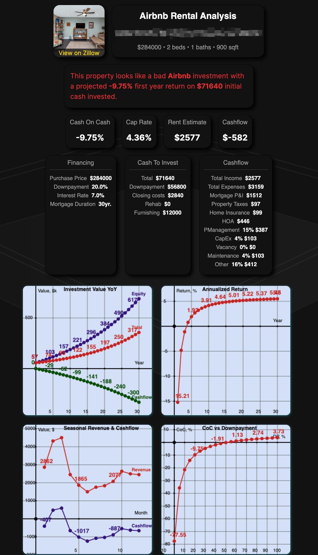 It is a blazingly fast and convenient way to analyze a property, mobile-friendly, detailed, and works anywhere with a browser and the Internet. One of the unique features is that you can paste the Zillow, Redfin, or Realtor.com URL directly to the search field and it will be able to process it and analyze the property for you. Just enter an address and see the analysis: